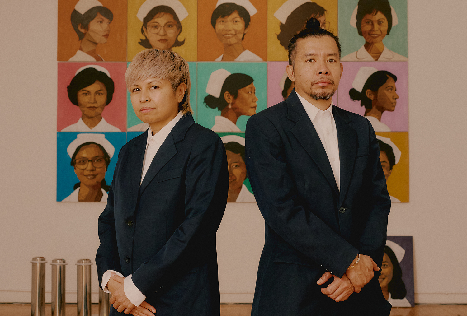 A portrait of two people standing side by side in dark suits before a wall of colorful paintings depicting Filipino nurses, part of their collaborative exhibition at the Queens Museum.A portrait of two people standing side by side in dark suits before a wall of colorful paintings depicting Filipino nurses, part of their collaborative exhibition at the Queens Museum.