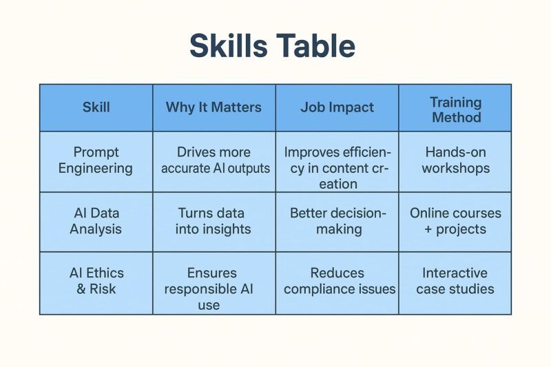 Knowledge literacy, immediate engineering, evaluating AI outputs, accountable AI use, and cross-functional collaboration are prime priorities. Human judgment and context stay essential.