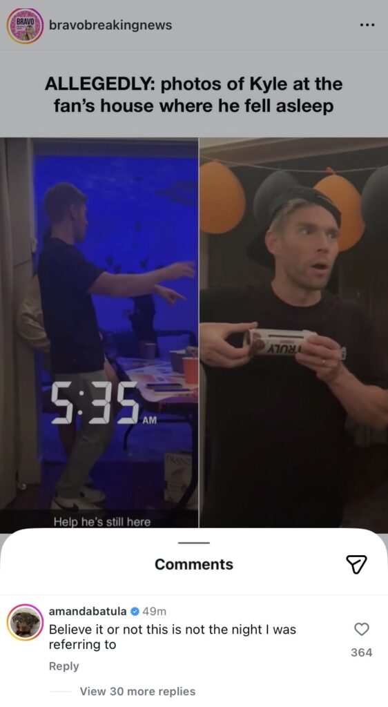 In images shared by gabe_duncans_realtor on TikTok, by way of @bravobreakingnews on Instagram, Kyle was seen partying at a mysterious location, apparently at 5:35 a.m.