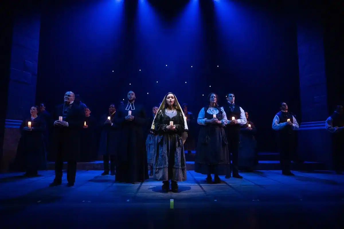 The lush, choral score by composer Grégoire, with lyrics from Lionel Florence and Patrice Guirao, blends melodic depth reminiscent of Frank Wildhorn’s “Jekyll & Hyde” and the works of Alain Boublil and Claude-Michel Schönberg. Eyma delivers a compelling lead as Bernadette, showcasing Broadway-caliber vocals and sincerity honed through years portraying the role in Europe. Jérémie Roy shines as her devoted yet conflicted father, François, with powerful singing and strong acting.