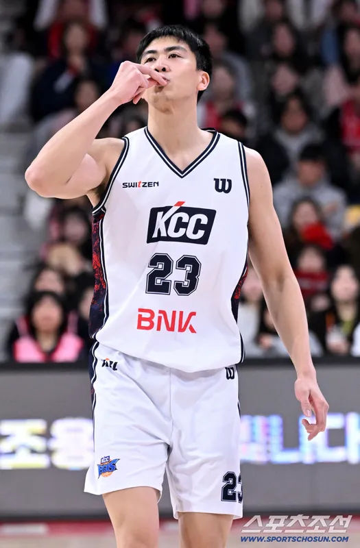 Busan KCC forward Navarro sank a key 3-point shot, igniting the crowd with a jubilant celebration. He blew a kiss to his hand, showcasing his excitement after the successful basket.