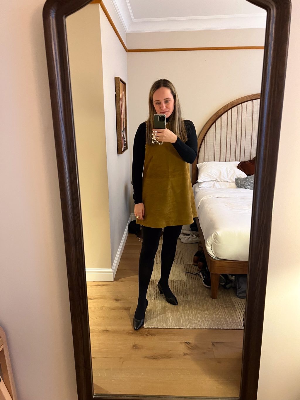 I like this Tuckernuck mini. Just like the Sezane one I’m sporting above, it’s nice layered over a turtleneck. Whereas I’ve you, purchase this turtleneck bodysuit! It’s the proper layering piece. I additionally love the thought of going full on with an extended suede costume like this one.