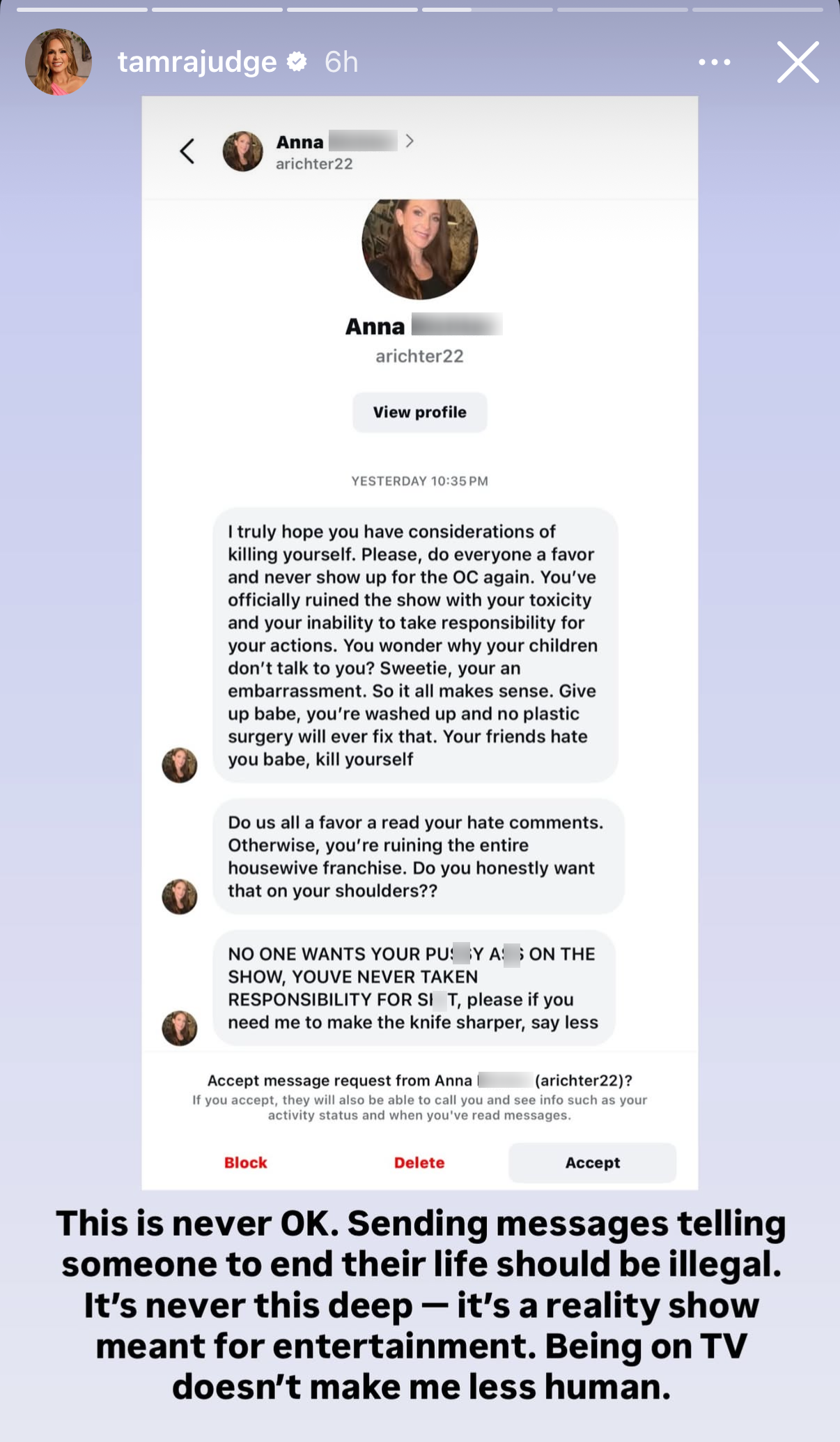 Tamra then wrote over the screenshot, “That is by no means OK. Sending messages telling somebody to finish their life needs to be unlawful. It’s by no means this deep — it’s a actuality present meant for leisure. Being on TV doesn’t make me much less human.”