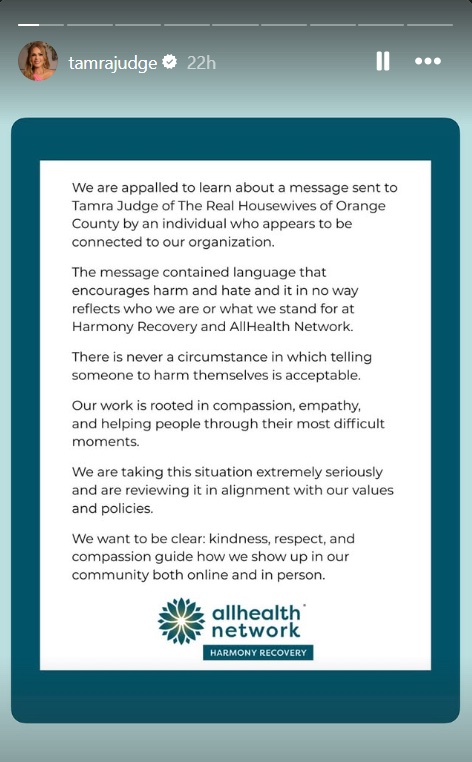 “We’re appalled to study a message despatched to Tamra Choose of The Actual Housewives of Orange County by a person who seems to be linked to our group,” wrote the corporate on Instagram. “The message contained language that encourages hurt and hate and it under no circumstances displays who we’re or what we stand for at Concord Restoration and AllHealth Community.”